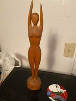 In the first description, the brown, khaki or grey clay vase is a pretty good description of the brown wood figure. The swirling pattern of the second object is accurate, amazingly so.